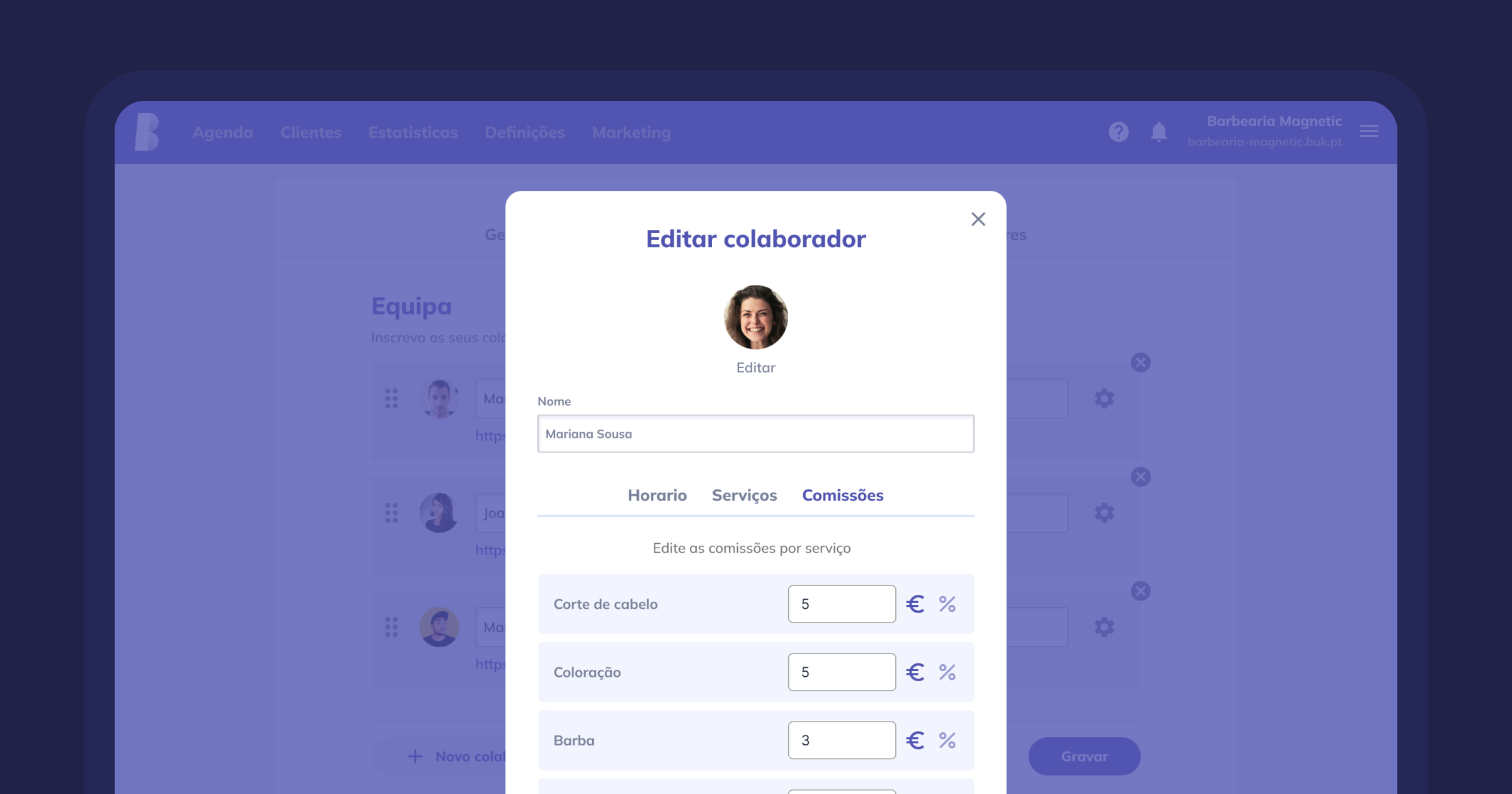 Nas configurações dos colaboradores pode agora definir comissões personalizadas por serviço: Valor fixo ou percentagem sobre o serviço.